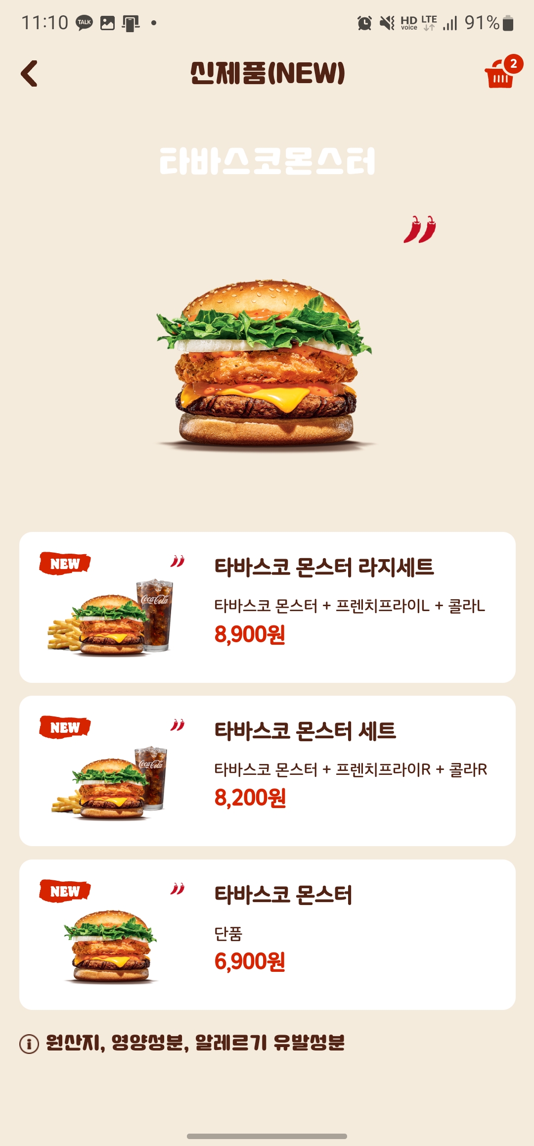 딜리버리 기준, 버거킹 타바스코 몬스터 가격은 단품 6900원, 세트 8200원, 라지세트 8900원입니다.